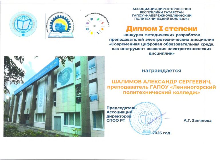 Преподаватель ГАПОУ «Лениногорского политехнического колледжа» Шалимов Александр Сергеевич награждён Дипломом I степени конкурса методических разработок преподавателей электротехнических дисциплин. Конкурс проходил...