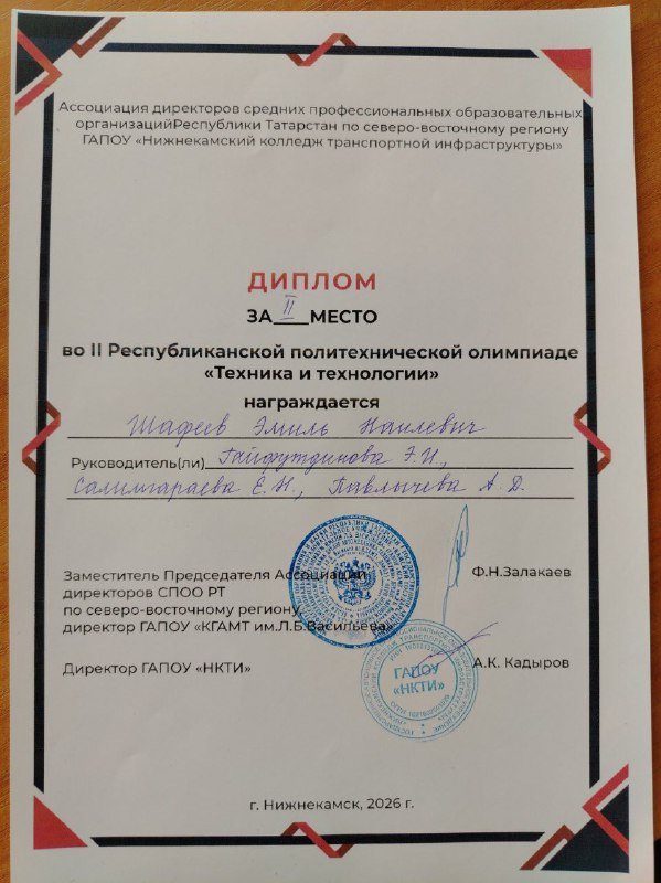 13 марта, состоялась II Республиканская политехническая олимпиада “Техника и технологии” среди  средних профессиональных образовательных организаций РТ на базе Нижнекамского колледжа транспортной инфраструктуры. Олимпиада проходила в два этапа, включая теоретические и практические задания, охватывающие огромный спектр профессиональных дисциплин и профессиональных модулей по девяти укрупненным группам профессий,  специальностей.