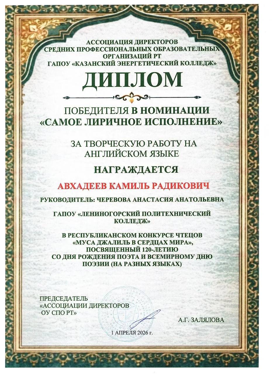 🏆 Камиль Авхадеев был удостоен победы в номинации «Самое лиричное исполнение». Его проникновенное прочтение стихотворения Мусы Джалиля на английском языке отличалось глубиной, искренностью и тонким чувством поэтического слова.