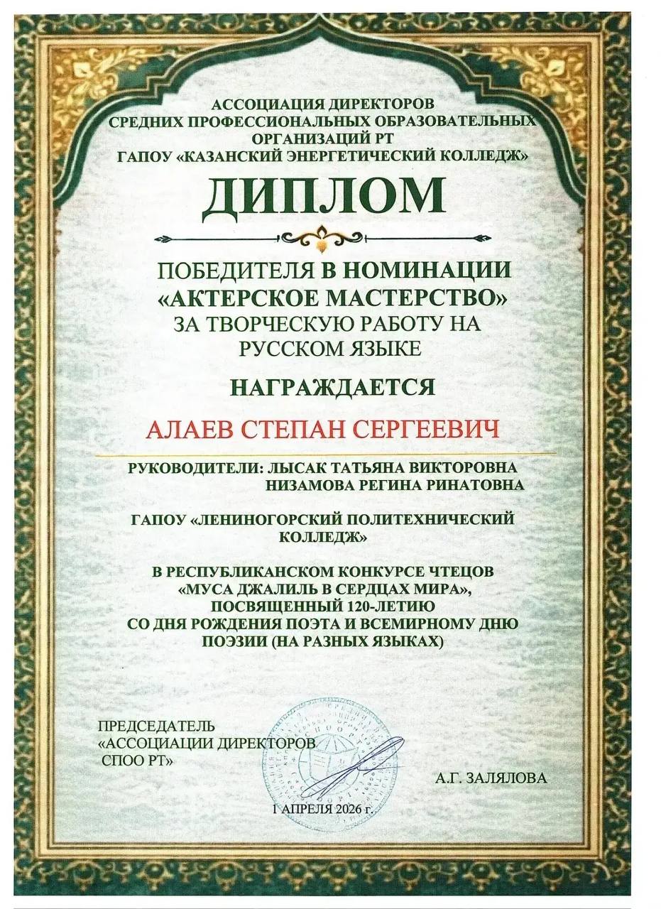 🏆 Степан Алаев стал победителем в номинации «Актёрское мастерство», продемонстрировав яркое сценическое воплощение произведения и выразительность исполнения.